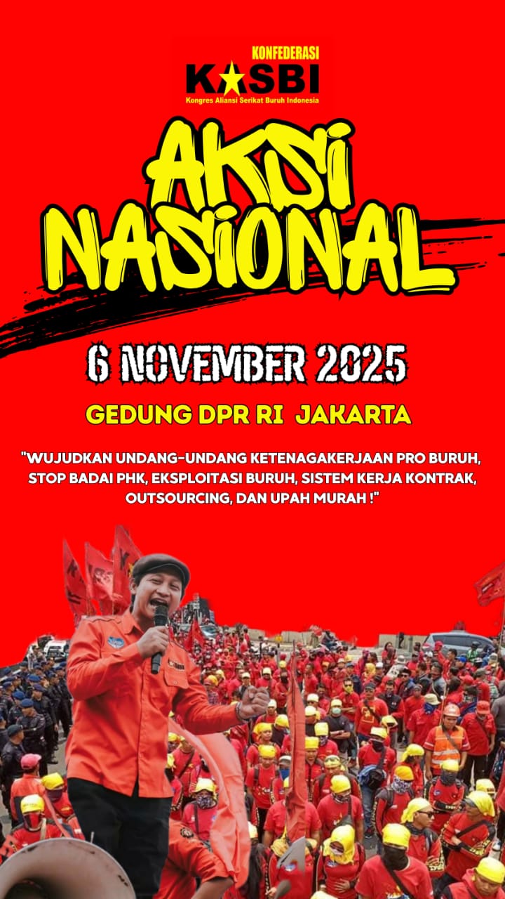 Jakarta, suarapinggiran.com (5 November 2025) — Konfederasi Kongres Aliansi Serikat Buruh Indonesia (KASBI) akan menggelar Aksi Nasional di depan Gedung DPR RI, Jakarta, pada Kamis, 6 November 2025, dengan tema “Wujudkan Undang-Undang Ketenagakerjaan Pro Buruh, Hentikan Eksploitasi, Sistem Kerja Kontrak & Outsourcing, Upah Murah, dan Badai PHK!”